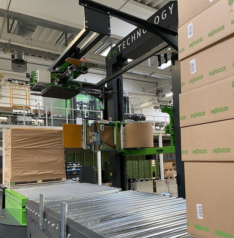 Der Clou steckt aber auch in der Technologie, die das Papier um die Paletten wickelt. EW Technology hat spezielle Wickelmaschinen entwickelt, die das Material präzise und mit der nötigen Spannung um die Waren legen. „Plastik verzeiht fast alles. Es dehnt sich einmal mehr, einmal weniger, passt sich an Formen an und damit entstehen nicht so große Spannungsspitzen“, erklärt Patrick Wagner, Geschäftsführer und Mitgründer von EW Technology, um gleich auf die Unterschiede zum Papier zu kommen: „Beim Papier muss bei der Wicklung die Zugkraft sehr präzise ausgeregelt werden. Hier müssen Regelung und Wickelmaschine alles kompensieren, was dem Papier an Flexibilität fehlt.“ „Diese Regelungsgüte wird durch die verwendete SIMATIC-Steuerung mit schneller Rechenleistung und kurzer Zugriffszeit in Verbindung mit dem Servoantriebssystem SINAMICS S210 für hochdynamische Anwendungen ermöglicht“, so Bernhard Fath, Vertriebsspezialist bei Siemens Österreich. Siemens-Technologie findet man in den EW-Technology-Spezialmaschinen auch im Schaltschrank (Netzteil, Schaltgeräte, Bedienelemente, …) und bei der SIWAREX-Wägetechnik sowie den Safety- Komponenten.